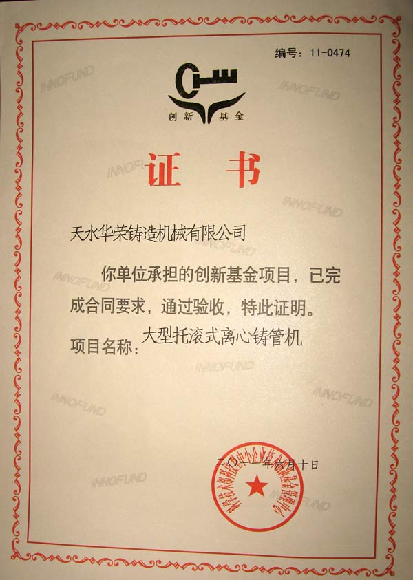 日前,天水華榮鑄造機(jī)械有限公司收到了國(guó)家科技部中小企業(yè)創(chuàng)新基金管理中心頒發(fā)的創(chuàng)新基金項(xiàng)目驗(yàn)收合格證書(shū),編號(hào):11-0474,至此,天華鑄機(jī)承擔(dān)的“大型托滾式離心鑄管機(jī)”項(xiàng)目產(chǎn)品各項(xiàng)技術(shù)經(jīng)濟(jì)指標(biāo)達(dá)到合同要求,正式通過(guò)國(guó)家驗(yàn)收。